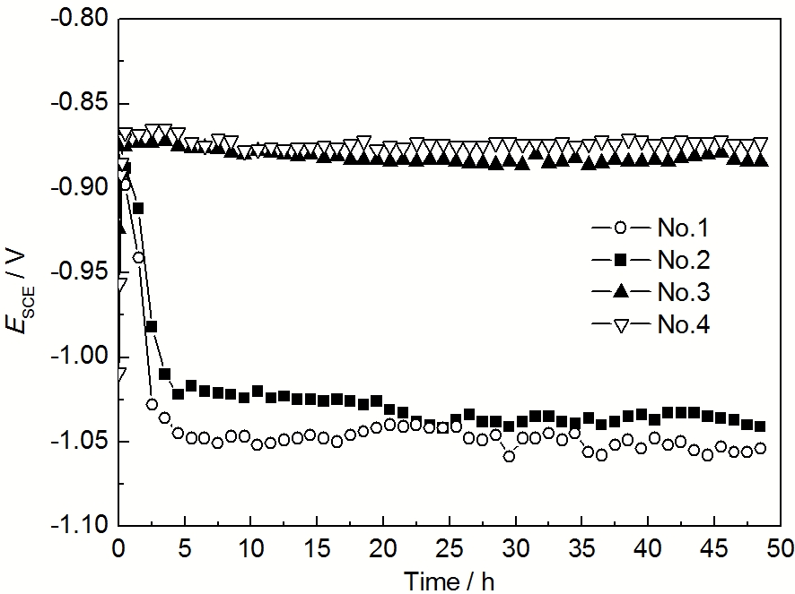 图3 1#~4#试样耦合电位随时间变化关系曲线
