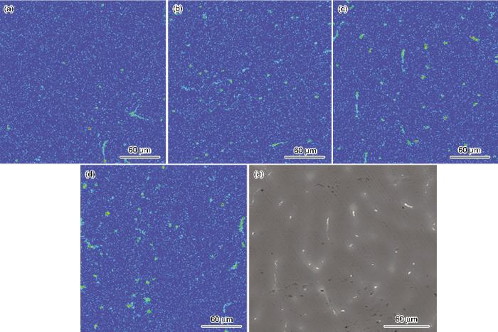 Fig.2 Fe element distribution of sample 1# (a), sample 2# (b), sample 3# (c), sample 4# (d) and 3# backscattering image (e) of Fe distribution