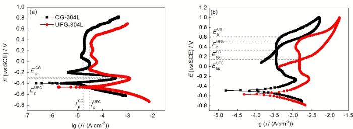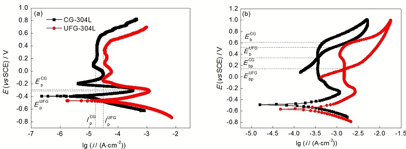 通过ECAP连续挤压处理, 304L SS的晶粒显著拉长并细化, 平均晶粒尺寸由50 mm细化至(130±30) nm, 形成大量的高角晶界. 由于细晶材料晶界含量的显著增加, 系统能量随之增加, 可以促进304L SS的活化溶解, 降低其在含Cl?溶液中的表面钝化能力, 这与传统的腐蚀理论一致.