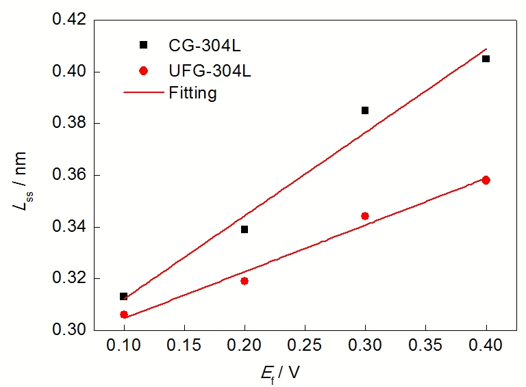 由图6和表3可以看出, 随着Ef的增加, Rf逐渐增加, 表明钝化膜逐渐致密, 耐蚀性逐渐增强. 在相同Ef下, UFG-304L SS表面Rf均小于CG-304L SS, 表明UFG-304L SS表面钝化膜致密性低于CG-304L SS, 因此其耐蚀性更低, 这与文献[29,30]一致.