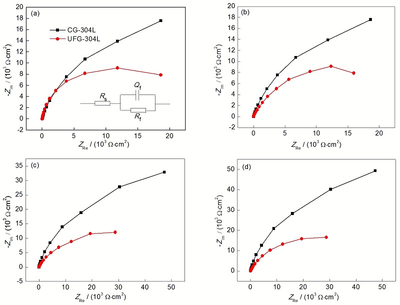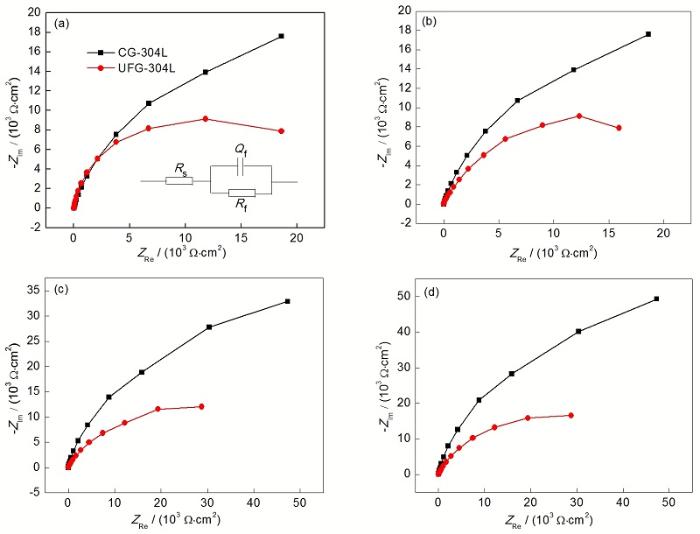![]() | Fig.6 Nyquist plots of passive films on the UFG-304L SS and CG-304L SS formed in 0.05 mol/L H2SO4+ 0.05 mol/L NaCl solution at Ef =0.1 V (a), 0.2 V (b), 0.3 V (c) and 0.4 V (d) (Inset in Fig.6a shows the equivalent circuit. Rs—solution resistance, Rf—passive film resistance, Qf—passive film capacitance)图6 UFG-304L SS和CG-304L SS在0.05 mol/L H2SO4+ 0.05 mol/L NaCl溶液中不同Ef下形成钝化膜的Nyquist曲线 |