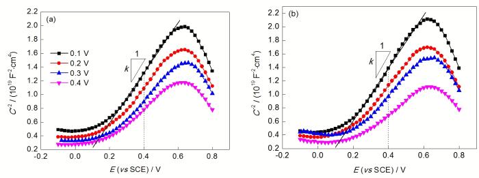 式中, Nd和Na分别代表施主和受主的载流子密度; k 为C-2与E线性关系的斜率; e0=8.85×10-12 F/m, 为真空电容率; e为室温下钝化膜的介电常数, 本工作取15.6[23]; Efb为平带电位; K=1.38×10-23J/K, 为Boltzmann常数; T为热力学温度; e=1.602×10-19C, 为单电子电量; 室温下KT/e约为25 mV, 可以忽略不计.