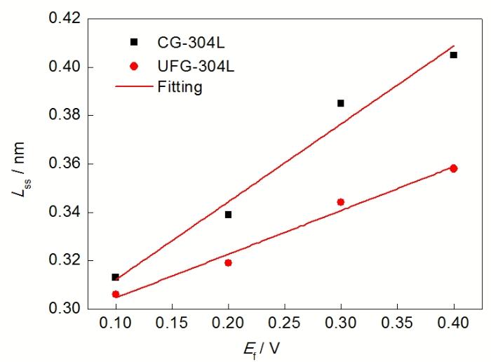 图5为利用式(4), (6)~(10)计算的UFG-304L SS和CG-304L SS在0.05 mol/L H2SO4+ 0.05 mol/L NaCl溶液中的Lss-Ef数据. 相同Ef下, UFG-304L SS和CG-304L SS表面形成钝化膜的厚度差别不大. 不同Ef的Lss与Ef之间可用线性关系拟合, UFG-304L SS拟合直线的斜率小于CG-304L SS, 表明UFG-304L SS表面钝化膜的生长速度比CG-304L SS慢. 根据式(4)~(10)以及曲线拟合, 可获得UFG-304L SS和CG-304L SS表面钝化膜的扩散系数: