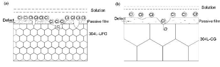 ![]() | Fig.7 Schematics of pitting corrosion for UFG-304L SS (a) and CG-304L SS (b) in 0.05 mol/L H2SO4+0.05 mol/L NaCl (DB—diffusion coefficient of Cl- along grain-boundary, DL—diffusion coefficient of Cl- in lattice)图7 UFG-304L SS和CG-304L SS在0.05 mol/L H2SO4+0.05 mol/L NaCl溶液中点蚀示意图 |