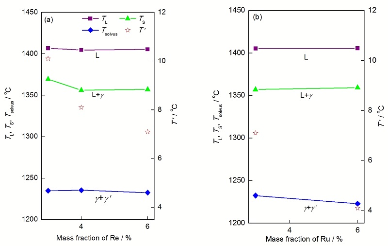 Liu等[15]基于一种第三代单晶高温合金, 通过调整Re和Ru的含量设计系列模型合金, 系统研究了添加Re和Ru对单晶高温合金凝固特性的影响. 图2显示了添加Re (<6%, 质量分数, 下同)和Ru对合金特征温度的影响规律. 结果表明, 随着Re 含量的增加(3%~6%), 单晶高温合金的液相线温度变化不大, 固相线温度降低约12.5 ℃, 结晶温度间隔扩大; 临界形核过冷度T’降低约3 ℃. Ru 含量的增加(0~3%)对固相线和液相线温度影响并不明显, 临界形核过冷度降低约3 ℃. Re和Ru的加入明显降低合金的临界形核过冷度, 使得杂晶的形成倾向加剧, 合金铸造性能降低.