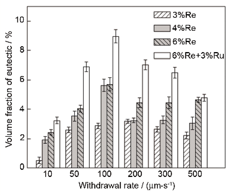 单晶合金的发展首先导致凝固特性的变化. 随着Re 和Ru 的添加, 铸态组织中共晶含量显著增高. 添加Re对液相线温度影响不大, 但会降低固相线温度, 从而扩大结晶温度间隔. Re和Ru的加入还会明显降低合金的临界形核过冷度, 使得杂晶的形成倾向加剧, 使合金铸造性能降低. Re也是偏析最为严重的元素之一. C和B微量元素对合金凝固特性也产生显著影响.