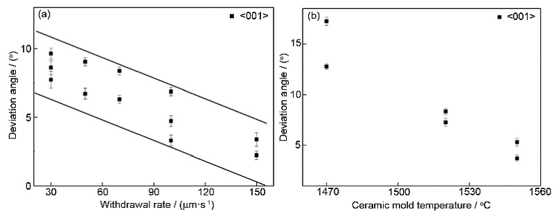 ![]() | Fig.9 Effects of withdrawal rate (a) and ceramic mould temperature (b) on the crystallographic orientation[28]图9 抽拉速率和铸型保温温度对选出单晶取向的影响[28] |