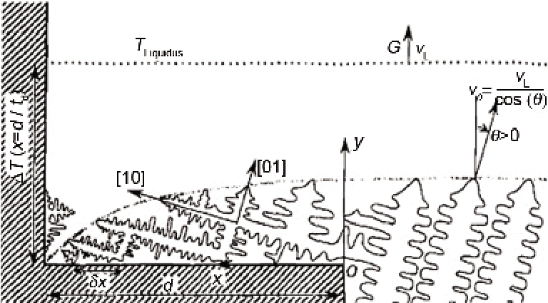 de Bussac和Gardin[38]基于KGT模型和大量假设对突变截面内的杂晶形核进行了数学推导, 得出了突变截面内部杂晶形成的判据:
