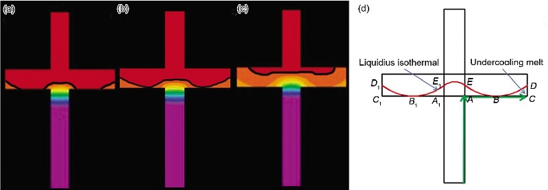 ![]() | Fig.12 Simulation results of temperature field distribution in the blade platform at t=1740 s (a), t=1742 s (b) and t=1770 s (c), and schematic showing the liquidius isothermal in platform (d)[34]图12 叶片平台温度场演化及液相线温度等温线示意图[34] |