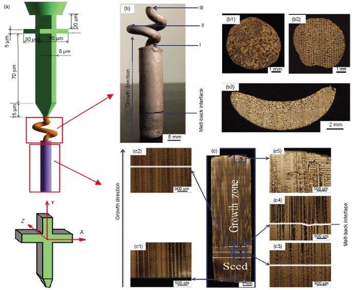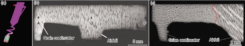 采用“籽晶+选晶”工艺也可以较好地解决回熔区杂晶的问题, 如图19所示[34]. 籽晶段回熔界面形成大量杂晶, 杂晶位于籽晶与模壳内壁之间的间隙处. 杂晶大部分很快被淘汰, 少数杂晶可能长大, 但由于其起源于表面, 经过选晶器颈缩部分时, 被机械阻挡作用淘汰, 中间部分的晶粒才保留下来. 因此“籽晶+选晶”工艺中, 回熔界面和螺旋选晶段距离要尽量减小, 避免回熔杂晶长入中心, 导致杂晶被选晶器选中.