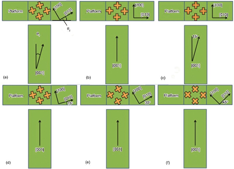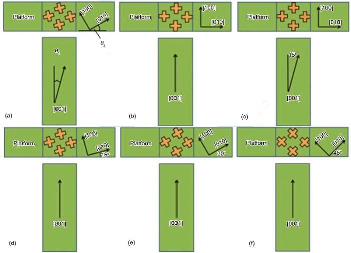 ![]() | Fig.17 Schematic diagrams showing the layouts (a) of seeds in samples in ways of q1=0°, q2=0° (b), q1=15°, q2=0° (c), q1=0°, q2=15° (d), q1=0°, q2=30° (e) and q1=0°, q2=45° (f) (V=100 mm/s)[34]图17 籽晶的摆放示意图[34] |
