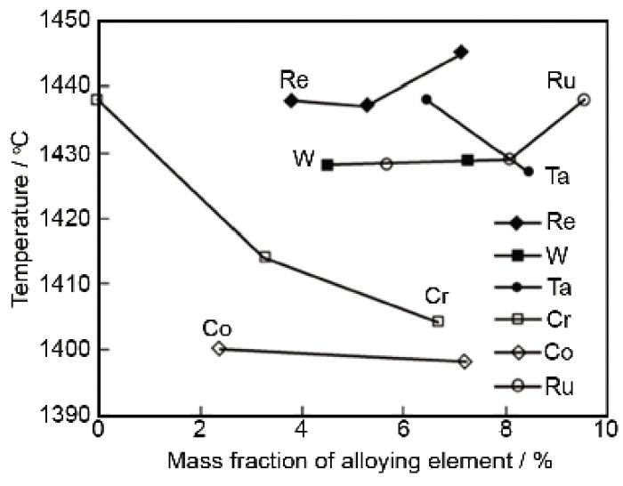 合金元素对凝固特征温度的影响有显著差异. Reed[9]整理了Ni-X二元系的固相线和液相线温度, 结果表明, 增加Re, W, Ru和Co含量, 可以提高该二元合金的液相线和固相线温度, 而Al, Ti, Ta, Mo等降低液相线和固相线温度. 其中Re, W, Ti, Ta等元素的影响特别显著. 但在复杂合金中, 这些影响规律并不相同. Murakami等[10]研究了Ni-19Al-xRu三元合金系, 证明添加Ru可以增加三元合金的液相线温度. Kearsey等[11]通过分析几种合金的差热曲线(DTA), 得到加入难熔元素Re可以明显提高合金的液相线和固相线温度的结果. Feng等[12]的研究表明, 当Re和Ru的加入超过一定含量后, 才会明显提高液相线温度, 加入Co降低液相线温度, 如图1[12]所示. Heckl等[13]则认为Re的加入会明显提高合金的液相线温度, 但对固相线温度的影响较小, 而相比于Re元素, Ru对合金凝固温度的影响较小. Hobbs等[14]对几种单晶高温合金的差示扫描(DSC)分析表明, Ru的加入降低了固相线温度, 而对液相线温度则基本没有影响, 因而扩大了结晶温度间隔. 这些研究结果差异很大, 可以看出单晶高温合金的凝固特征温度与合金体系和成分的密切关系, 其规律还没有完全掌握.