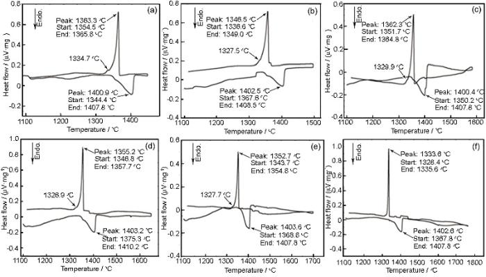熔体结构影响合金的凝固特性. 在金属和合金熔体中, 存在着不同尺寸的原子集团, 这些原子集团的变化不仅与合金的种类和成分有关, 还与合金的熔体状态密切相关. 这些原子集团是凝固形核和长大过程中的亚单元. 因此, 通过熔体处理可以改变熔体的凝固特性, 从而影响铸件的凝固组织和综合使用性能. 近些年, 国内开展了通过单晶高温合金熔体热历史途径改善单晶高温合金凝固组织、降低凝固偏析、抑制缺陷的研究. 一种含4%Re第三代单晶高温合金不同熔体超温温度的DTA曲线如图4所示[25]. 随过热温度从1450 ℃升高到1780 ℃时, 临界形核过冷度不断增大, 从约32 ℃增加到约78 ℃. 合金熔体过热度较低时, 部分难熔质点的溶解使得形核核心减少, 过冷度增大. 随着熔体温度升高, 熔体中的类固型中程有序原子团簇逐渐解离为短程有序团簇, 使得形核核心增加. 这与难熔质点溶解所起的作用刚好相反, 因而过冷度没有明显变化. 当熔体过热到很高温度如1700 ℃以上时, 短程有序原子团簇进一步解离并通过静电作用围绕在尺寸很小的难熔质点周围, 形成新的多元原子团簇结构. 这种新结构难以作为形核核心, 从而导致形核过冷度进一步增大.