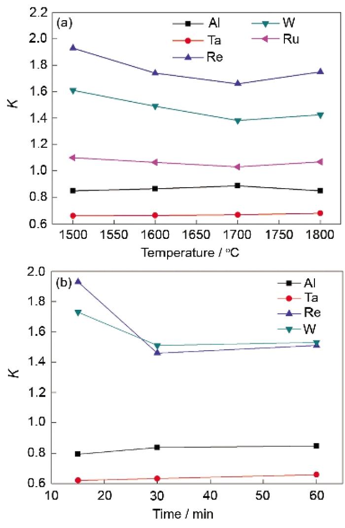 ![]() | Fig.5 Effects of superheating temperature (a) and superheating time (b) on the partition coefficient K of the constituent elements in alloy DD90图5 镍基高温合金DD90中各组元的分配系数随过热参数的变化 |