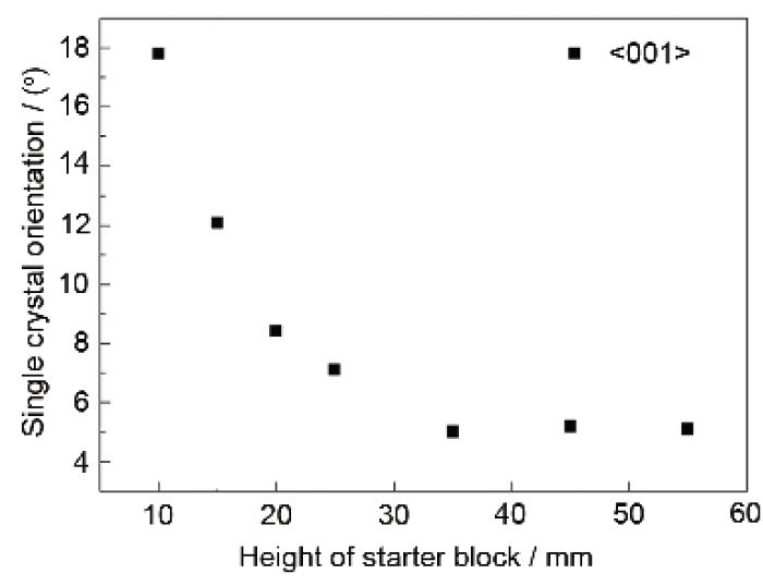 ![]() | Fig.7 Relationship between grain orientation deviation and initial height of the starter block[28]图7 晶粒取向偏差与起始段高度的关系[28] |