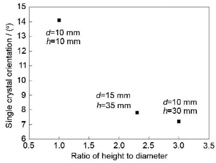 张晓越[31]进一步考察了起始段高度和直径比对选出晶粒取向的影响, 结果如图8[31]所示. 图中d和h分别是起始段直径和高度, 可以发现, 随着高度与直径之比的增加, 单晶的<001>方向与试样轴向之间的夹角逐渐减小. 当起始段高度增加, 为<001>取向的晶粒淘汰其他取向的晶粒提供了更为充足的空间和时间. 随着起始段直径减小, 固/液界面前沿的温度梯度逐渐增大, 从而使起始段内择优取向的晶粒在竞争生长过程中的优势增加, 更加利于起始段内晶粒组织取向优化.