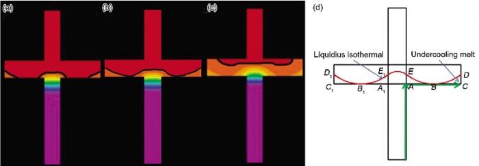 ![]() | Fig.11 Schematic of dendritic growth of a single crystal in the presence of a cross-section enlargement[38]图11 突变截面内部的枝晶生长情况[38] |