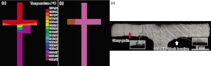 图15a为叶身与平台交界处设置石墨块温度场演变的模拟计算结果[49]. 可以看出, 添加石墨块以后, 在石墨块一侧液相等温线变得平滑, 防止了固/液界面在此处突变而导致的凝固组织的突变. 图15b为添加石墨块后的CAFE结果[49]. 可以看出, 石墨块的添加有效削弱了热节效应, 使突变截面处的热量沿已凝固叶身部分导出, 有效阻止了平台边角处杂晶的形成. 图15c为实验结果[49], 其中红色箭头所指出现杂晶, 白色箭头为石墨添加位置.