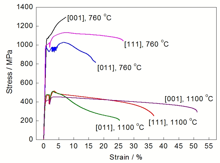 ![]() | Fig.3 Typical stress-strain curves of DD9 alloy with [001], [011] and [111] orientations at 760 and 1100 ℃图3 [001], [011]和[111]取向DD9合金在不同温度下的典型应力-应变曲线 |