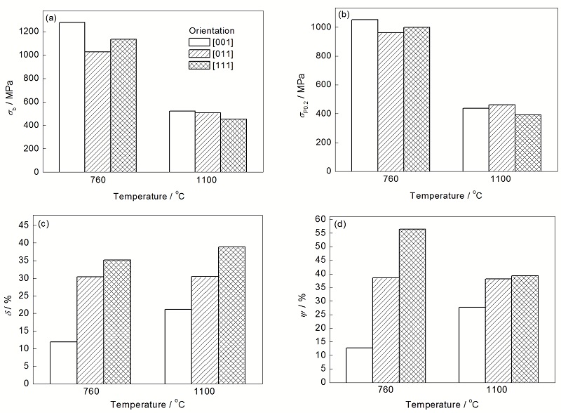 (3) 随着温度升高, 合金的抗拉强度与屈服强度降低, 各向异性减弱; 除1100 ℃条件下[001]取向屈服强度略低于[011]取向以外, [001]取向DD9合金抗拉强度与屈服强度分别高于[011]和[111]取向合金的强度.