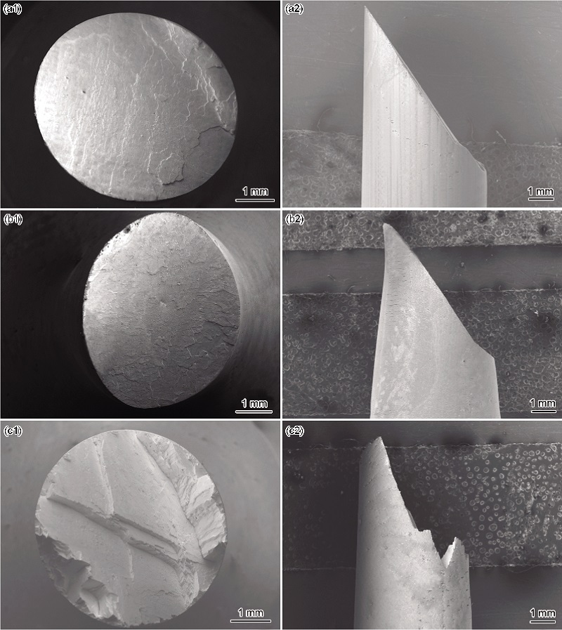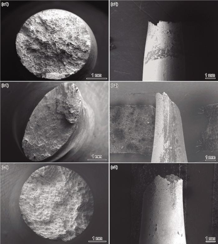 [001], [011]和[111]取向DD9合金760 ℃拉伸断口及纵向形貌如图5所示. 由图5a1和b1可以看出, [001]与[011]取向试样断口呈椭圆形, 表面存在河流花样; 从纵向看(图5a2和b2), 断口呈现一个楔形的大平面, 断裂面的法线方向与应力方向大约成50°~60°的夹角, 所不同的是[011]取向试样发生了较大颈缩现象. 这是由于[011]取向只有4个等价{111}<110>滑移系, 因此[011]取向试样独立滑移系最少, 其变形阻力及变形协调能力较低, 迫使晶体发生了转动, 断裂后试样发生较大的变形. 而由图5c1和c2可以看出, 尽管在760 ℃下[111]取向试样断口整体上也呈现楔形, 但断口由几个呈一定角度的滑移面组成, 说明在变形过程中至少有2个以上的滑移系主导. 综合上述, 可以认为DD9合金在760 ℃下3种取向断口均呈现类解理断裂特征.