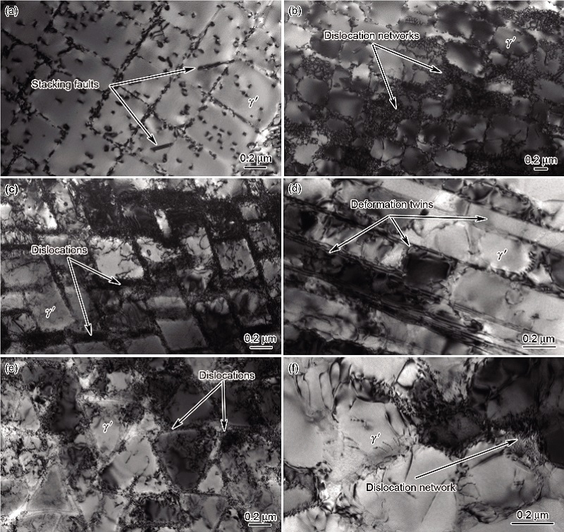 (5) 760 ℃拉伸时, [001], [011]和[111]取向DD9拉伸试样在基体通道内位错密度较高, [001]取向在γ’内出现了层错; 1100 ℃拉伸时, 开启了多个滑移系, [001]与[111]取向在基体通道内和γ’相内累积了大量的位错网, [011]取向出现了大量的形变孪晶条带.