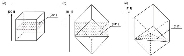 经过标准热处理后, [001], [011]和[111]取向γ’相都应呈规则的立方化, 之所以呈现出不同的截面形貌, 与截面的取向相关. 图8为[001], [011]和[111]取向DD9合金沿晶体生长方向垂直截面截取γ’相示意图, [001]取向试样横截面为(001)面, [011]取向试样横截面为(011)面, [111]取向试样横截面为(111)面, 从而展示出如图2所示的形貌.