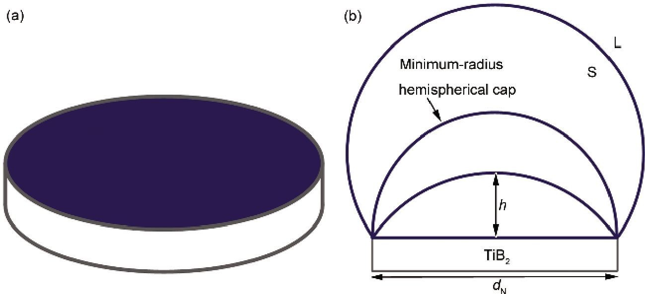为了建立经过Al-Ti-B细化处理的铝合金熔体凝固过程的形核模型, 简化了复杂的形核本质, 提出如下的假设条件: (1) 不考虑晶核的溶解与合并, 即假设原始形核数目等于最终的晶粒数目, 同时忽略细化剂的衰退影响; (2) 根据文献[23,24], 经过Al-Ti-B孕育的铝合金熔体, a-Al的初始形核过冷度非常小, 基本小于0.5 K, 甚至可以达到0.01 K, 因此可以认为当温度一旦低于液相线温度时, 形核就开始, 而当温度达到Tmin时, 形核结束; (3) 实验中观察到TiB2的形貌呈现六边形板状, 假设熔体中TiB2是唯一形核核心[25,26], 其{0001}基面如图1a所示.