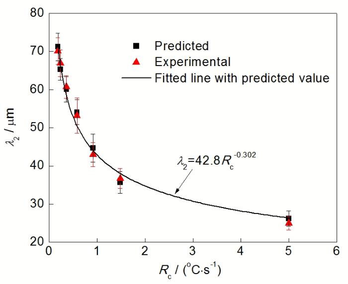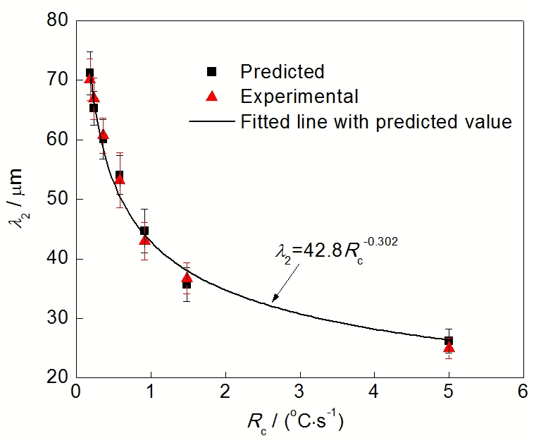 ![]() | Fig.10 Comparison between the predicted secondary dendrite arm spacing and the experimental ones solidified in different cooling conditions图10 不同测温点位置的二次枝晶臂间距模拟结果和实验结果对比 |