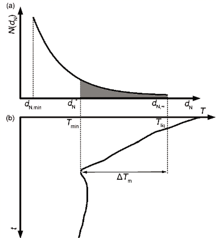 式中, y和k是通过实验统计获得的形核常数; ΔTm=Tliq-Tmin, 其中, Tliq为平衡液相线温度, Tmin对应于冷却曲线上的最低形核温度. 由于该模型基于实验数据拟合获得, 计算简单, 结果相对较为准确, 工程应用性强, 目前广泛应用在各种模拟软件当中, 但该模型中的参数缺乏明确物理意义. 本工作借鉴该模型思想, 建立了适用于铝合金等轴晶凝固的形核模型, 同时模型中的参数具有明确的物理意义, 并且能够方便地耦合到枝晶生长模型当中.