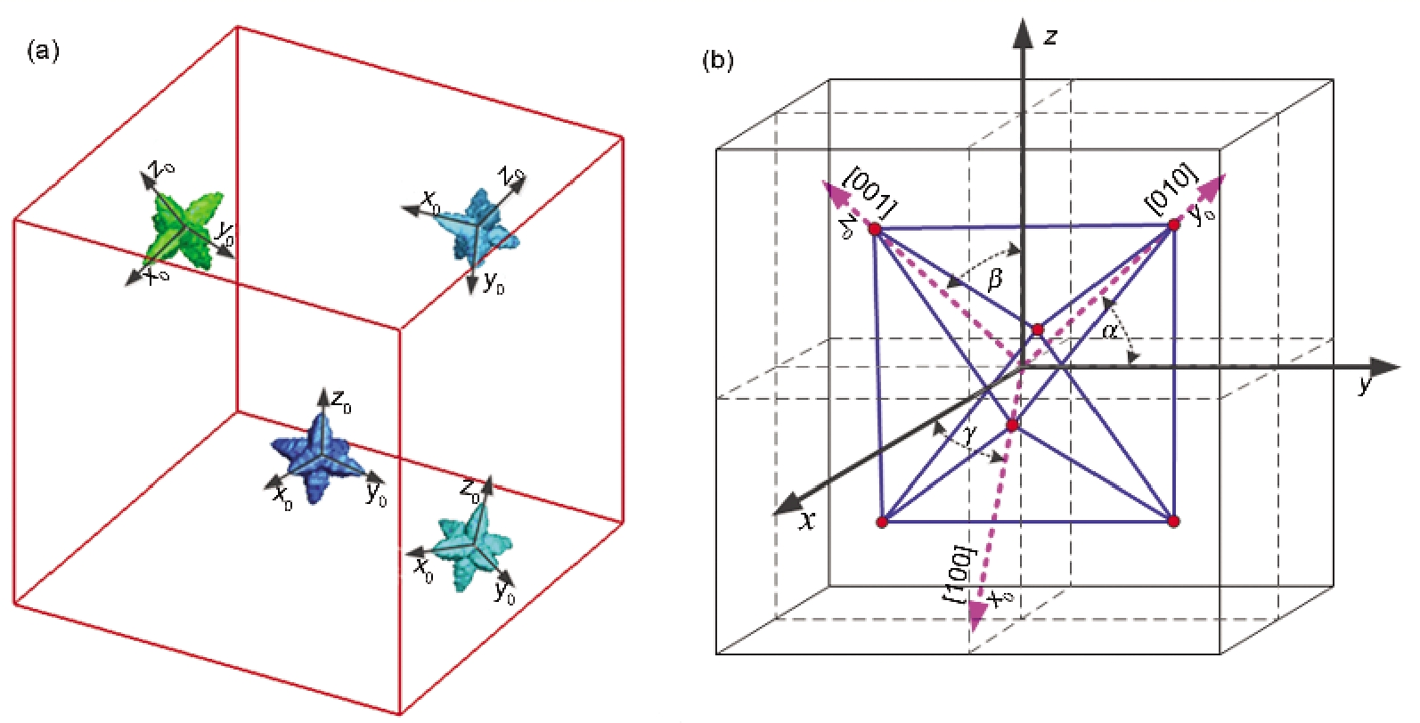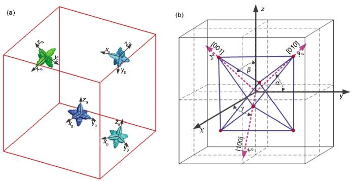 如图3a所示, 对于每一个枝晶都赋予其各自的局部坐标系(x0, y0, z0), 坐标轴沿着各自的[001]方向, 而世界坐标系(x, y, z)沿着网格划分方向, 因此2个坐标系之间的位置关系可以通过如下的空间坐标旋转矩阵Rotate1, Rotate2, Rotate3来实现.