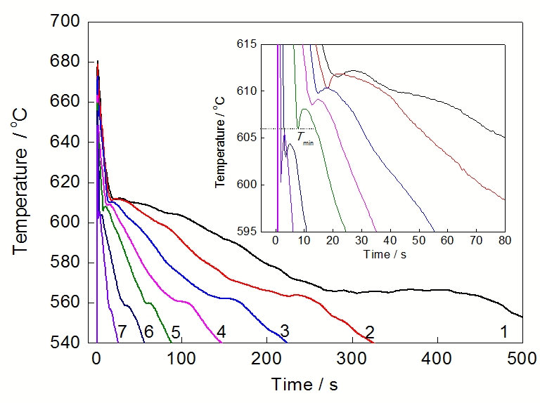 图5是不同测温点(No.1~No.7)的冷却曲线. 可以看到, 该合金的凝固过程主要包括2部分, 首先是 a-Al 形核生长, 并且明显可以看到在凝固初期, 由于 a-Al结晶潜热的释放, 在温度达到Tmin之后, 会出现温度的回升(再辉现象). 当温度达到共晶温度时, 出现(Al+Si)共晶反应, 并且由于大量凝固潜热的释放, 温度降低速率明显减慢. 从图5可以明显看到, 随着阶梯厚度从No.1的40 mm减小至No.7的4 mm, Tmin依次降低, 由No.1的611.3 ℃降低到No.7的595 ℃, Tmin的降低导致形核区间增大, 从而使得熔体中形成更多的有效核心, 形核密度增大.