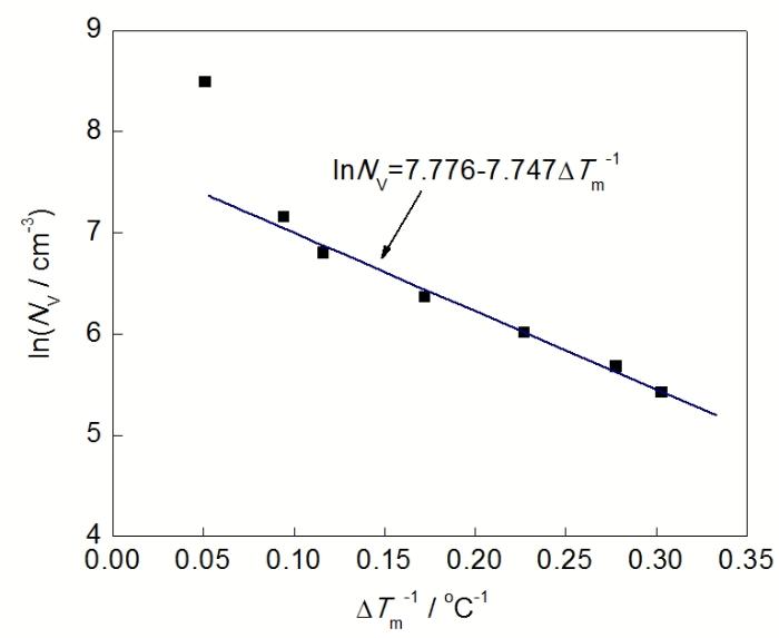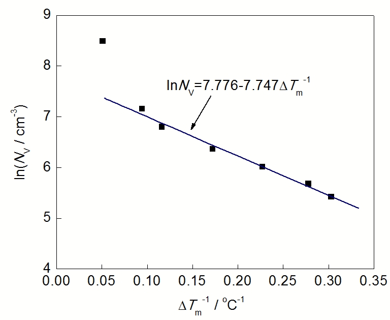 为了求得式(6)当中的参数N0和a, 需要利用表1中的ΔTm和NV数据进行曲线拟合. 首先对式(6)两边取对数, 该方程可以简化为ln(NV)相对于ΔTm-1的一次函数形式: