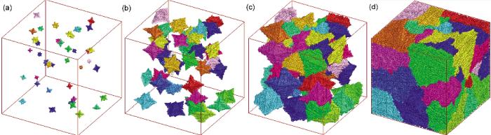 凝固过程中, 枝晶的优先生长方向是随机的, 如图3a中所示, 但是由于CA网格的各向异性, 会导致枝晶的生长方向偏离其固有的优先生长方向. 为了消除网格各向异性给枝晶生长带来的固有影响, 本工作采用了空间坐标变换和偏心算法来实现任意角度枝晶生长的模拟.