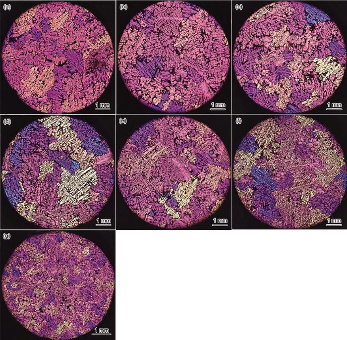 为了分析不同凝固条件下的组织形貌及晶粒尺寸大小, 在每个测温点处分别截取直径为8 mm的圆形截面试样(No.7处的试样直径为6 mm), 通过标准的制样工序获得金相试样. 本工作采用阳极覆膜和偏振光金相技术来区分不同的晶粒. 阳极覆膜剂采用的是38 mL H2SO4+43 mL H3PO4+19 mL H2O配制成的混合溶液, 电压为15 V, 电流控制在0.05~0.10 A范围内, 覆膜时间约40~60 s. 覆膜后的试样在Axio Scope.Al型且带有补偿器的金相显微镜(OM)下进行观察. 本工作采用面积法来测定面晶粒密度NS, 其公式为: