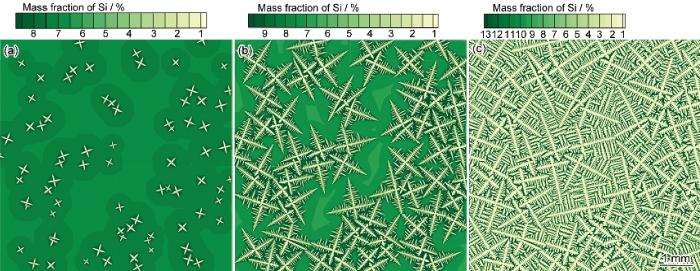 本工作利用建立的形核模型和三元枝晶生长CA算法, 针对No.1~No.7测温点处的微观组织开展相应的数值模拟. 为了体现所建立的形核模型对于该合金形核过程的适用性, No.1~No.6测温点处的形核数目由式(22)计算得到, No.7处根据表1中实测值代入, 并且模拟所需要的温度值通过查询实际测量的冷却曲线获得. 模拟所采用的Al-7Si-0.36Mg合金的热物性参数如表2中所示. 模拟所采用网格数目为1800×1800, 网格尺寸为4 mm, 枝晶的优先生长角度随机赋予. 图8给出了No.6测温点处的枝晶演化过程和溶质场分布. 从图中可以看到, 在凝固初期, 由于枝晶生长较慢, 界面前沿溶质富集程度较低, 枝晶以四重对称的形貌沿着各自的晶体取向自由生长, 并且没有出现明显的枝晶臂分支现象(图8a). 随着温度的降低, 枝晶生长速率v增大(ν∝ΔT2), 界面前沿溶质富集程度加剧, 导致成分过冷增大, 从而使固/液界面形态失稳, 出现明显的分叉现象, 二次枝晶臂高度发达(图8b). 此外, 随着枝晶不断长大, 相邻枝晶间的生长受到相互阻碍. 这种阻碍作用也主要以溶质场变化的形式体现出来. 当两相邻枝晶相互靠近时, 它们之间排出的溶质由于没有较好的扩散通道而不能及时带走, 从而在界面前沿富集形成高浓度液相区, 导致该处的枝晶生长速率减慢, 使得枝晶呈现为不对称生长(图8b). 在凝固末期, 剩余液相区的溶质高度富集, 枝晶尖端的生长受到抑制, 此时枝晶的进一步生长主要通过枝晶臂的生长、粗化、熔合等方式来实现, 而二次枝晶臂间距会自动的调整到一个合适的范围之内(图8c).