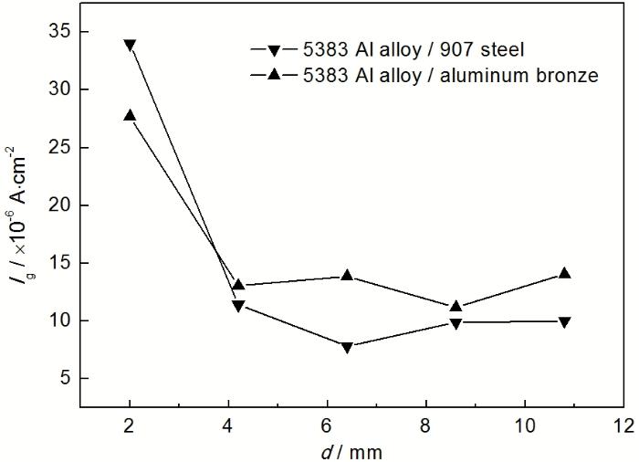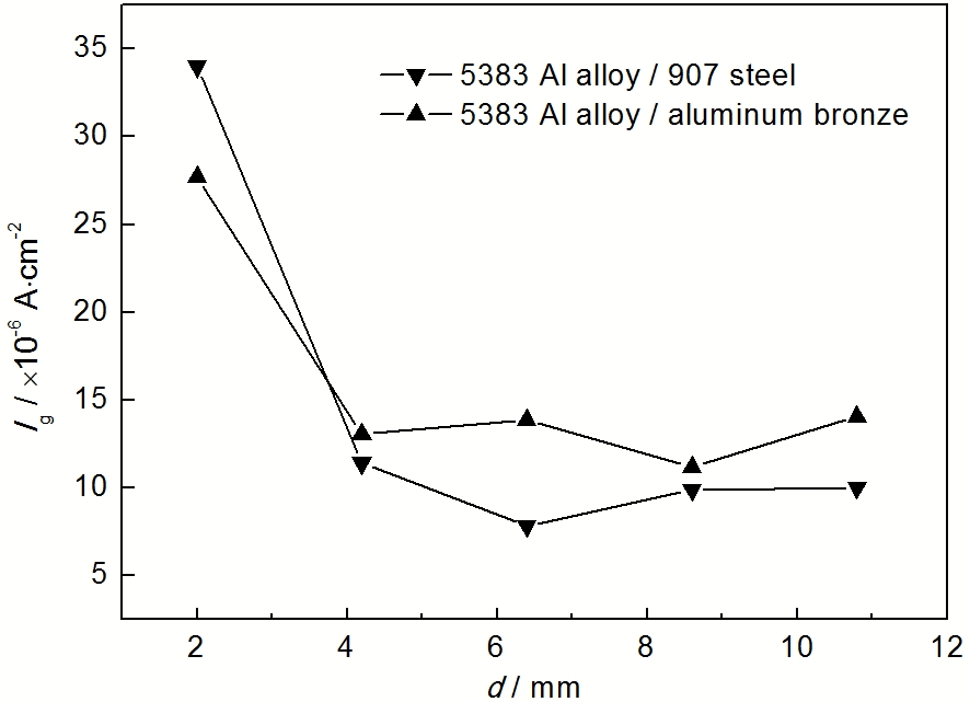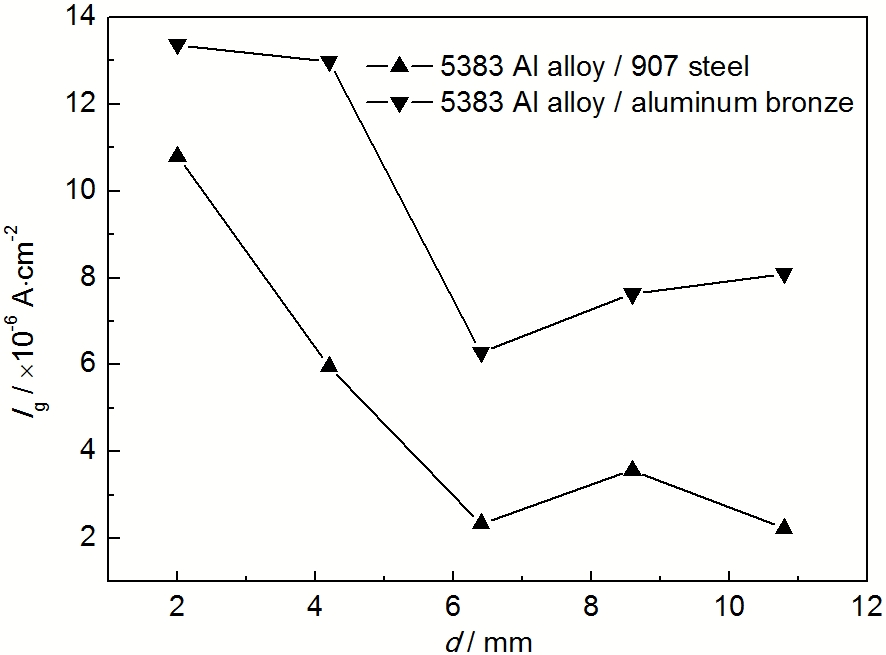 Galvanic corrosion performance of 5383 Al alloy coupled with 907 steel and aluminum bronze respectively in the early stage was studied by galvanic current test and scanning electron microscopy (SEM). The results showed that the 5383 Al alloy acted as anodes for the two galvanic couples, while 907 steel and aluminum bronze were cathode. The corrosion morphology of 5383 Al alloy could be metastable pitting, irregular stable pitting and filiform-like corrosion. The galvanic current density Ig of two couples varied similarly with immersion time, they decreased at the beginning and then became stable. The galvanic current density decreased with the increase of distance from the couple joint, and it became uniform in the far end. Compared with the couple 5383 Al alloy/aluminum bronze, the galvanic corrosion for couple 5383 Al alloy/907 steel was less severe, but it was more concentrated with in an area of 2 mm nearby the joint line.