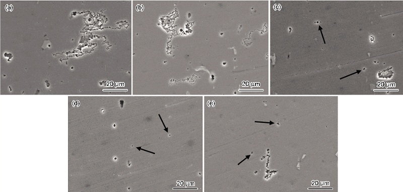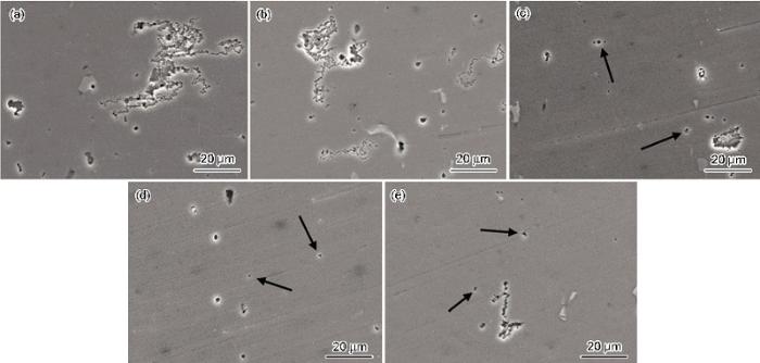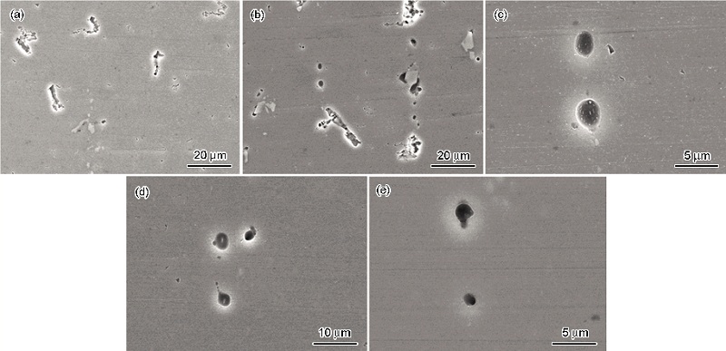 图9所示为与铝青铜偶接10000 s后不同距离处5383铝合金的腐蚀形貌。电偶电流较大的1#和2#区域出现较多形状呈长条形的点蚀,类似于长度较短的类丝状腐蚀 (图9a和b),同时还可以观察到零散分布、尺寸小于3 μm、形貌呈圆形的亚稳点蚀 (图9c)。当与偶接点距离增加至6.4 mm以上,3#~5#区域的5383铝合金表面腐蚀形貌基本一致,只观察到零散分布的亚稳点蚀 (图9d和e)。