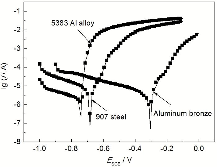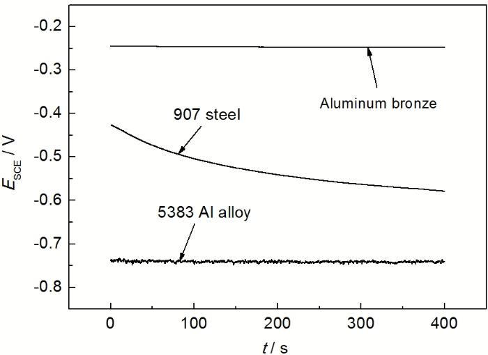 极化曲线采用CHI 660B电化学工作站进行测量。参比电极为饱和甘汞电极 (SCE),对电极为铂电极。测试时扫描速率为1 mV/s, 5383铝合金、907钢和铝青铜的电位扫描范围分别是-1.0~-0.1,-1.0~-0.1和-0.9~0 VSCE。