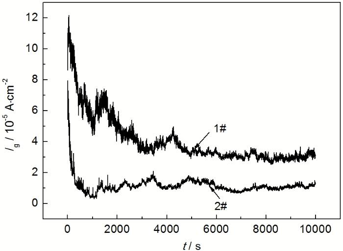 Fig.5 Ig-time distribution of 1# and 2# areas in 5383 Al alloy/aluminum bronze galvanic couple