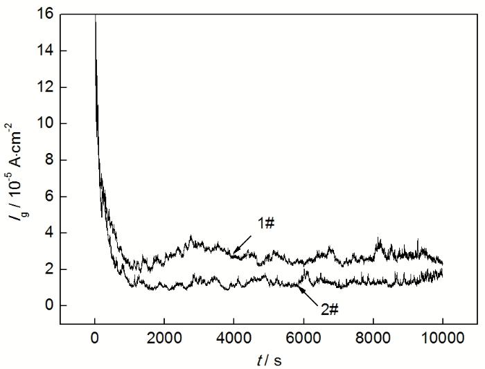 Fig.4 Ig-time curves of 1# and 2# areas in 5383 Al alloy/907 steel galvanic couple