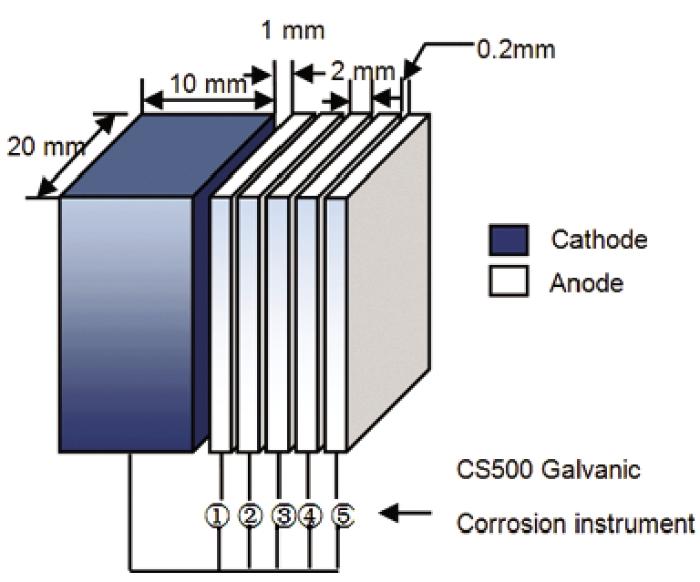 用于测量电偶电流和电偶电位的模拟电偶腐蚀样品如图1所示。电偶腐蚀样品都由一块阴极材料 (907钢或铝青铜) 和5片阳极材料 (5383铝合金) 组成。阴极与阳极的总面积一致,均为2 cm2。五片阳极的中心与阴极的距离依次为2.0,4.2,6.4,8.6和10.8 mm,分别编号为1#~5#区域。电极背面焊接导线,绝缘层距离为0.2 mm。电偶腐蚀样品由环氧树脂密封,仅上表面 (测试面) 暴露,并经打磨、抛光、风干后备用。