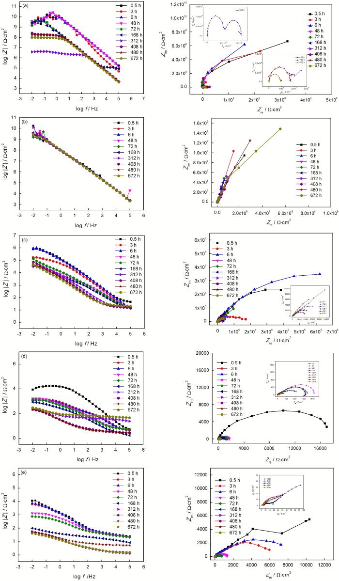 Fig.4 Bode and Nyquist plots of the coated panels with different contents, (a) 0, (b) 5%, (c) 15%, (d) 25%, (e) 35%