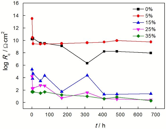 图6给出了不同涂层的涂层电阻随浸泡时间的变化。从图6可以看出, 镍粉体积分数为15%、25%和35%的涂层电阻一直都相对较小。而体积分数为0的涂层保持相对较高的涂层电阻, 但是整体是下降趋势, 且有一个明显的低谷后增长又降低的过程, 体积分数为15%的涂层也出现类似的情况。在整个浸泡过程中, 体积分数为5%的涂层电阻除一开始有降低, 6 h后一直保持109 Ωcm2的高涂层阻抗, 超过体积分数为0的涂层一个数量级, 且始终未出现下降趋势。涂层电阻是涂层抗腐蚀性介质渗透能力的重要反应, 可用来评价涂层的防护性能。体积分数为5%的镍粉氟碳涂层的涂层电阻处于较高的水平, 且变化不大, 说明镍粉添加适量, 具有最好的抗腐蚀性介质渗透的能力。