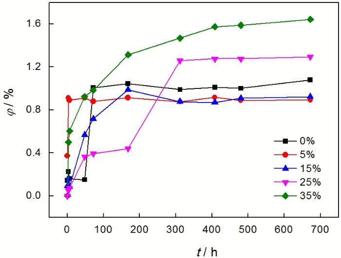 计算涂层中水的吸收量。其中φ为水传输进入涂层的体积分数, Ct和Co分别为时间t时的电容和初始电容。将由等效电路拟合出的涂层电容值的变化带入上述公式, 可计算出不同涂层吸水的体积浓度随浸泡时间的变化。涂层吸水率随时间变化的拟合结果, 如图7所示。可以看出, 镍粉体积分数为5%和15%的涂层, 最后稳定时的吸水量比体积分数为0的涂层低, 说明此添加量的片状镍粉起到了抑制水渗透的作用。而对于体积分数为25%和35%的涂层, 因为涂层失效较快, 抗水分渗透的作用较弱。