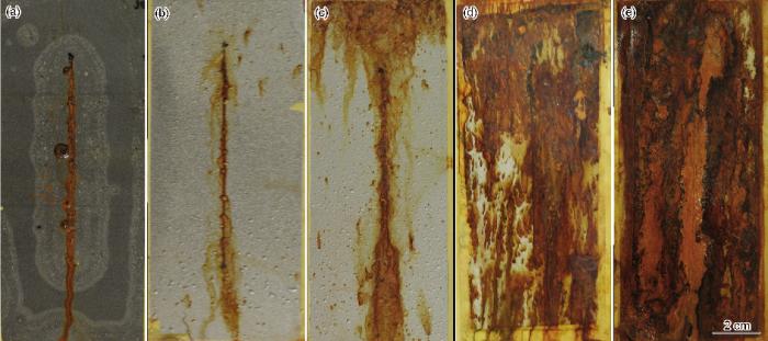 Fig.2 Coated panels after salt spray tests for 800 h, (a) 0, (b) 5%, (c) 15%, (d) 25%, (e) 35%