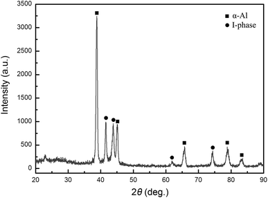 Al-18Mn master ingot was prepared by induction melting of pure Al (99.9%) and Mn (99.9%) under an argon atmosphere. Ribbons were obtained by spun the molten of master alloy onto a rotating copper wheel, which rotated at a linear velocity of 52.3 m/s. The ribbons were typically 40 μ m in thickness and 8 mm in width.
