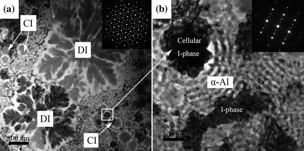 | Fig.3 a TEM micrograph of as-spun ribbon showing dendritic I-phase (DI) and cellular I-phase (CI); b magnified image of the square area in a |