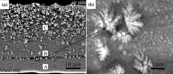 Figure 1a shows the cross section of the ribbon, where a progressive microstructure variation with the distance from the cooling substrate can be observed. Three distinct layers can be identified through the whole cross section, marked as A, B, and C. Region A is in the vicinity of the copper wheel and subjects to the largest cooling rate, and the microstructure is composed of rather uniform distributed tiny spherical quasicrystalline particles with sizes of a few tens of nanometers in an α -Al matrix, which is similar to the result of Boncina in melt-spin Al-Mn-Be alloy [19]. Region B features the emergence of fine cellular particles with a few dendrites. In region C, which is furthest from the cooling substrate, the microstructure is composed of coarse dendrites (about 5-10 μ m). According to the XRD pattern in Fig.2, only α -Al and I-phase peaks can be identified. EDS results show that the dendrites and cells have significant Mn concentration. Therefore, the discernible dendrites and cells in Fig.1a are all I-phases. Figure 1b is the magnified image of the interface between regions A and B, where a group of fine cellular I-phases with a few randomly distributed dendritic I-phases can be observed.