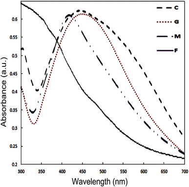 By comparing the UV spectra for the synthesized Fe3O4-AgNs (Fig. 1: C, G, M and F), broad absorption peak and slight red shift to approximately 430 nm indicate a wider size distribution and larger particle size for Fe3O4-AgNC (Fig. 1: C).